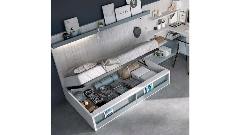 Tenemos más ideas para ti, como el panel que aparece en la parte trasera de la cama canapé juvenil.
