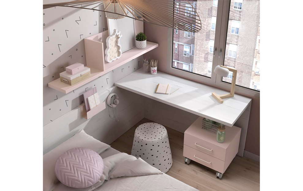 El escritorio juvenil que aparece en la foto también es totalmente personalizable, ya que puedes elegir medidas, distribución y demás.