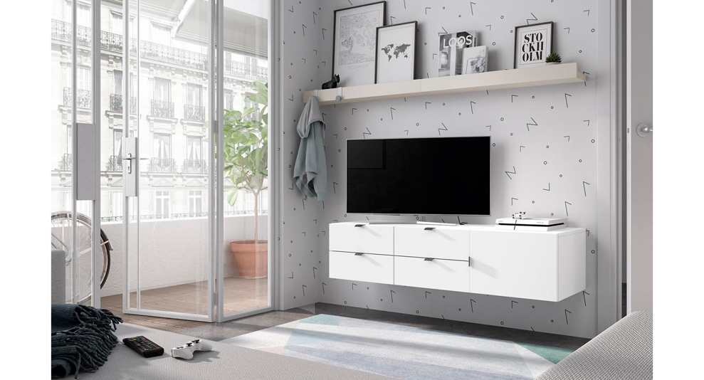 Aprovecha el espacio de la habitación con un aparador colgado con puerta y cajones, donde podrás poner la televisión.