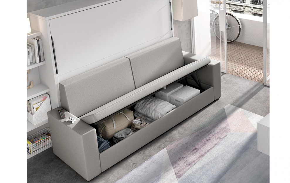 La cama abatible con sofá además, también dispone de estanterías en su interior.