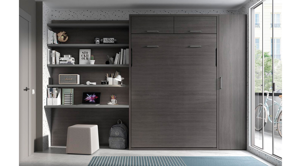 Una cama abatible vertical con un armario a la derecha y un altillo.