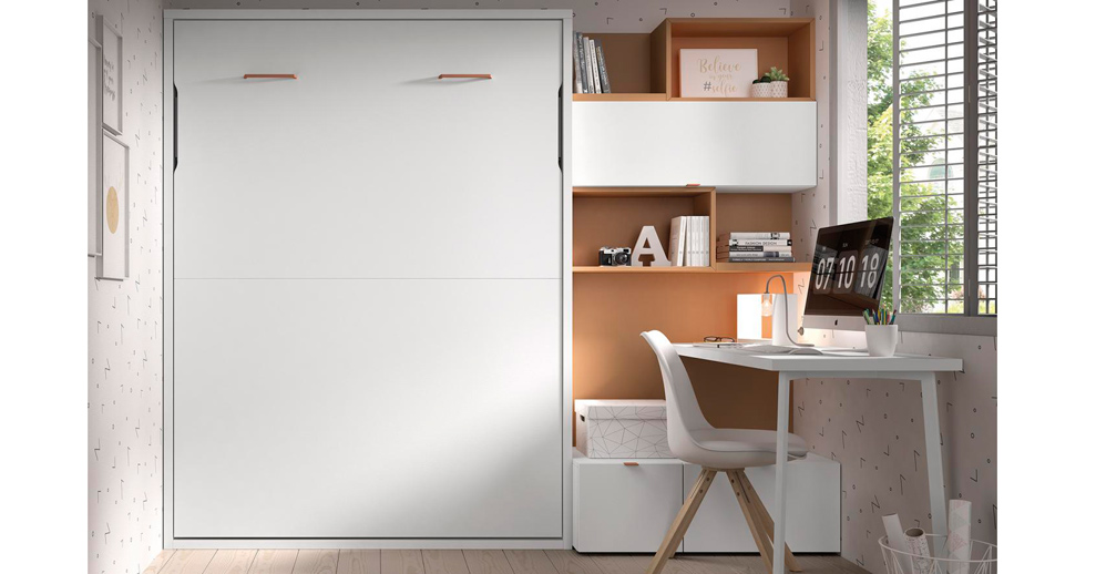 Convierte tu habitación en un despacho en un momento. Si guardas la cama, quedan el escritorio y las estanterías, por lo que durante el día puede servir de despacho. ¿Qué te parece la idea?