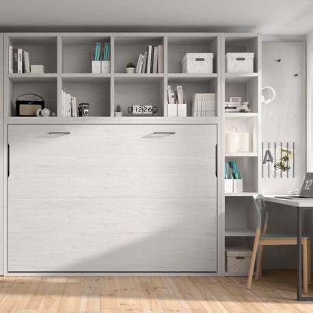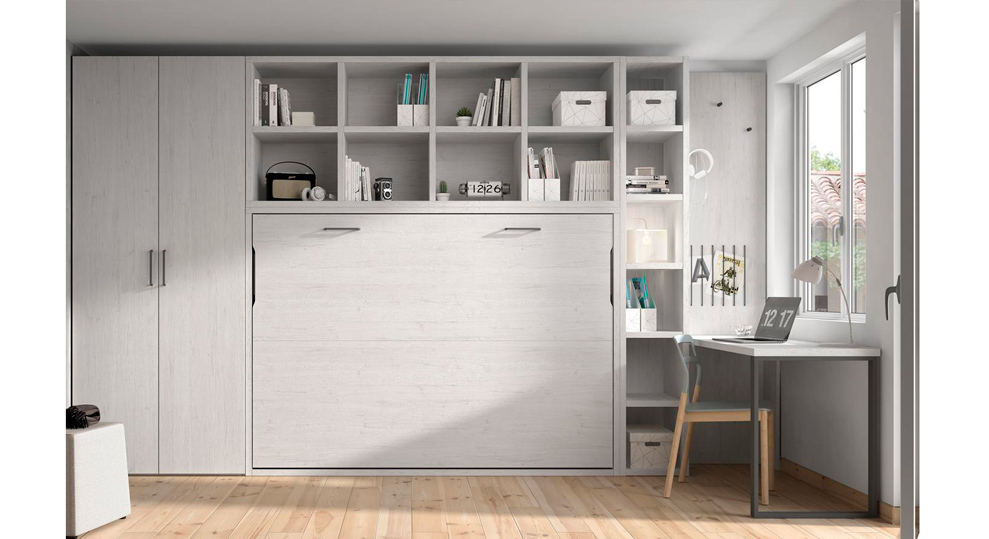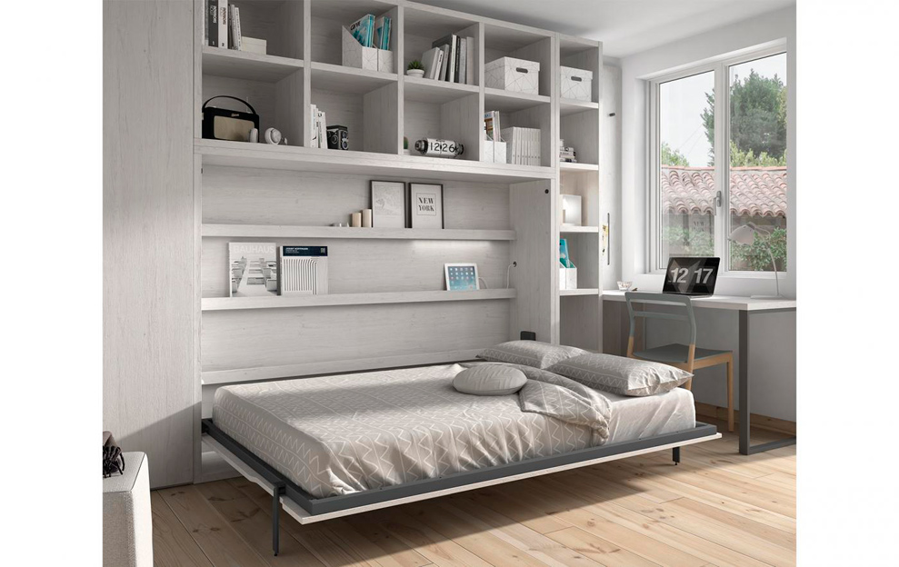 Una cama abatible de 135 para dormir a tus anchas, utilizar las estanterías para decorar e incluso, en las estanterías interiores, encontrar un USB y luz LED. ¡Lo tendrás todo!