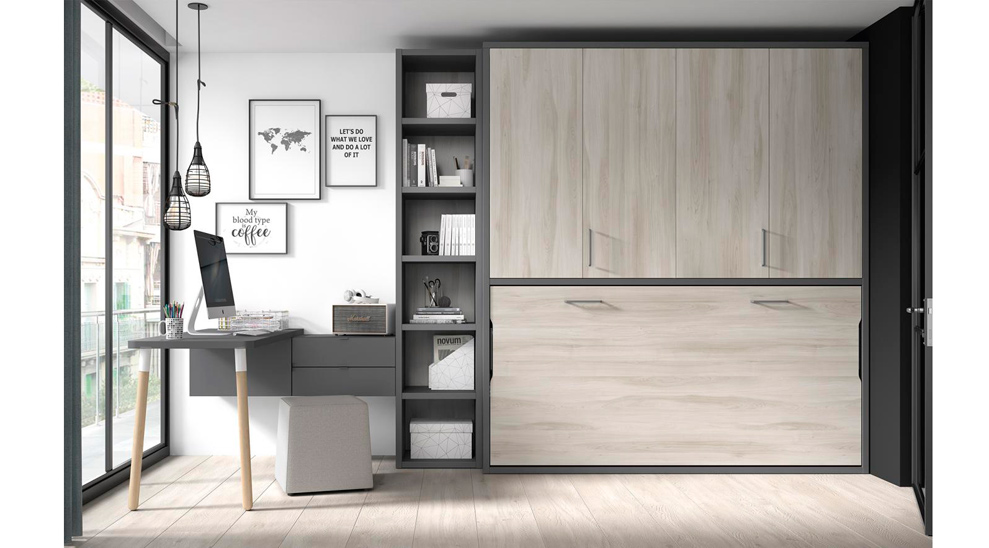 Una cama abatible con armario que puede utilizarse como despacho, como habitación para los invitados o como habitación habitual. Tú decides el uso que le quieras dar, y también cómo quieres que sea.