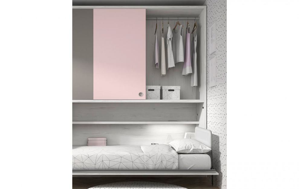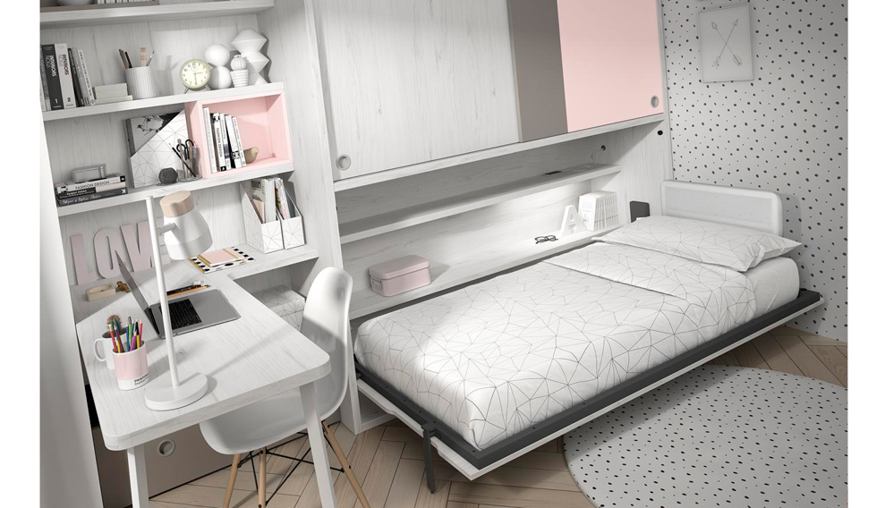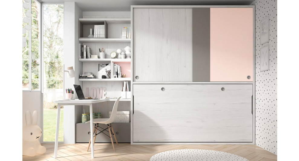 Más información Gestionar cookiesHabitación Juvenil compuesta de cama abatible horizontal, armario de puertas correderas, escritorio y estanterías.
