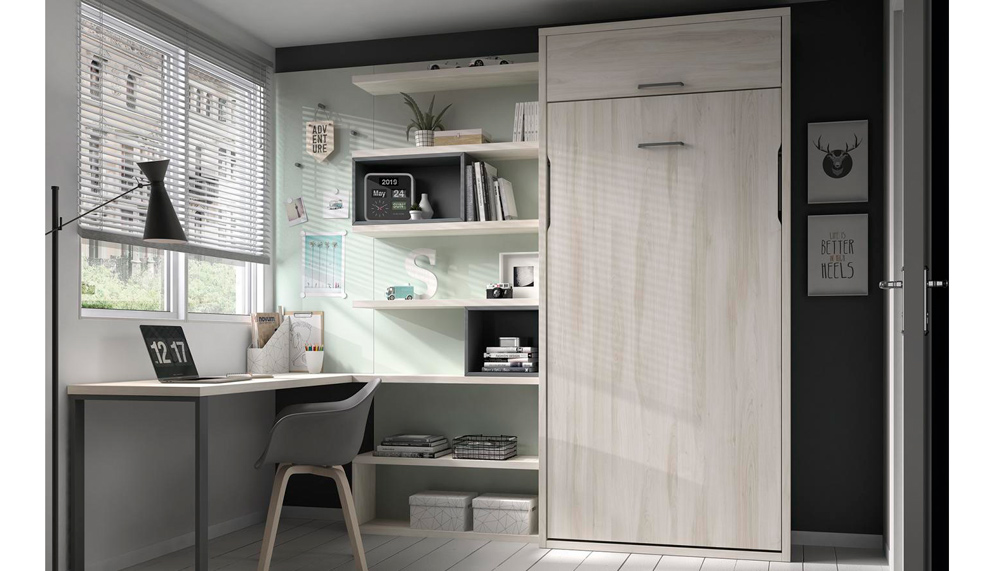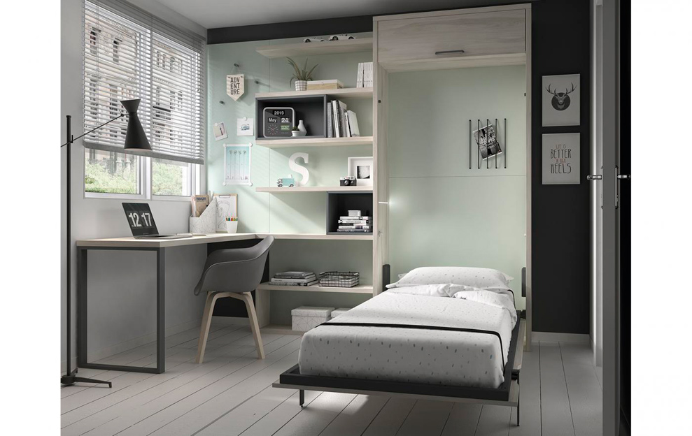 Crea una habitación juvenil con una cama abatible vertical. Inspírate en esta composición para crear la tuya en tu tienda de muebles más cercana.