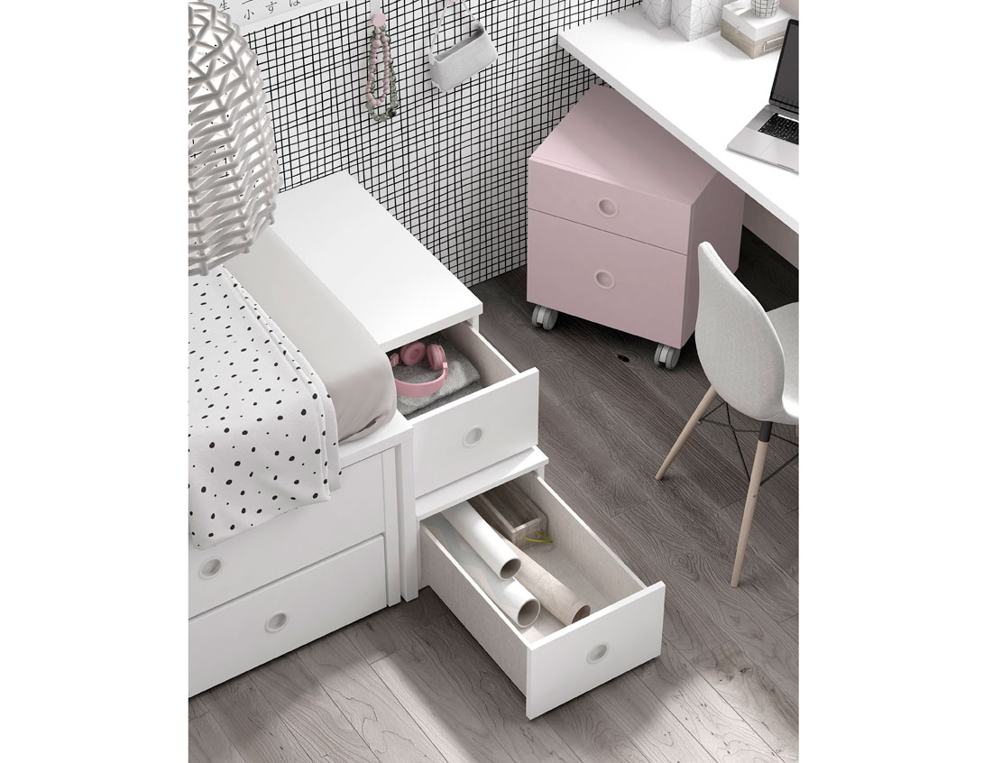 Para que te hagas una idea de las medidas de la cama, en esta habitación hemos utilizado una cama compacta superior, una cama deslizable y tres cajones. La cama superior es para colchón de 190 × 90, mientras que la cama deslizable es para colchón de 180 × 90.