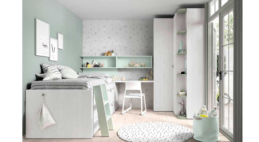 Combinar el verde agua de nuestro catálogo con el color Nevada, es una combinación ideal para un dormitorio infantil. Este modelo de cama compacta infantil con cajones y una cama nido de la misma medida, una opción innovadora. Además también vemos reflejado en nuevo color Laurel, ¡es una pasada!