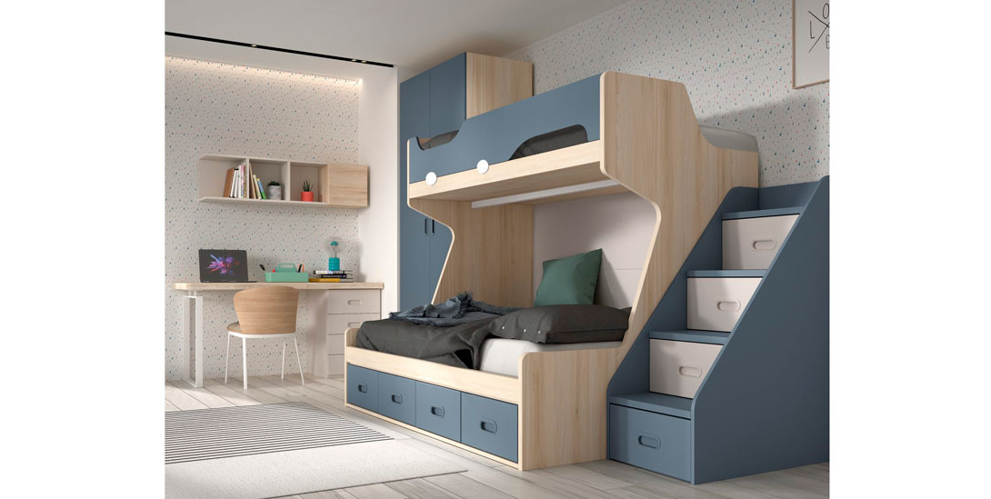 Más información Gestionar cookiesDormitorio Juvenil formado por litera y diferentes cajones para almacenaje. Una habitación para compartir.